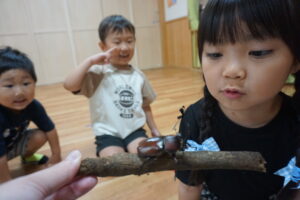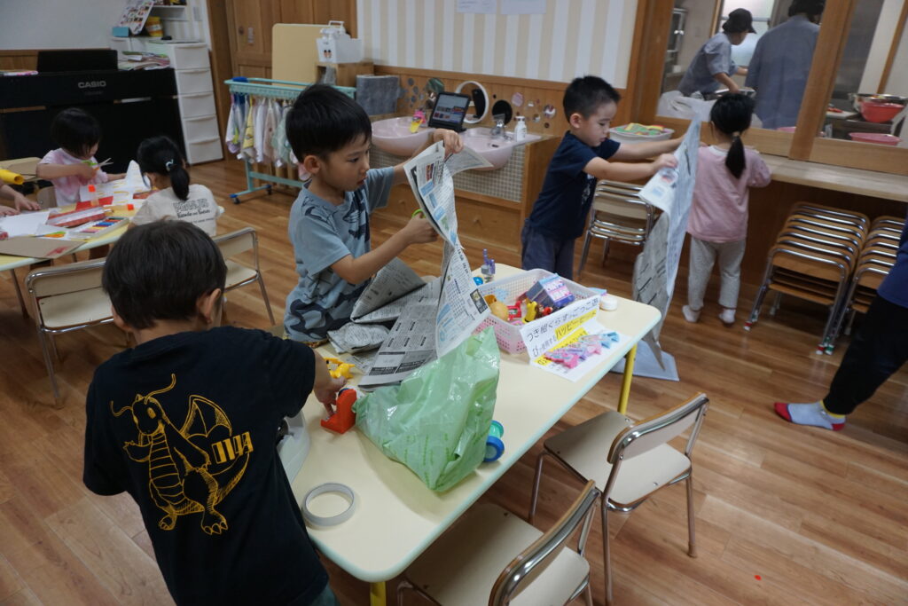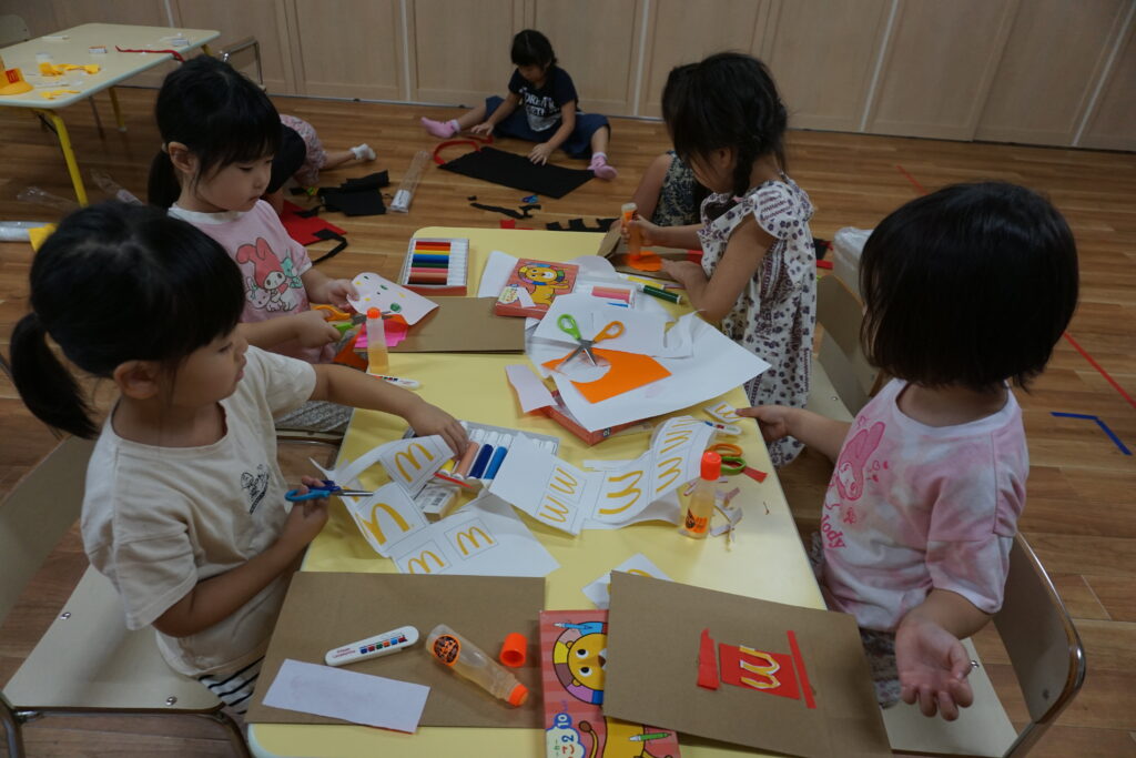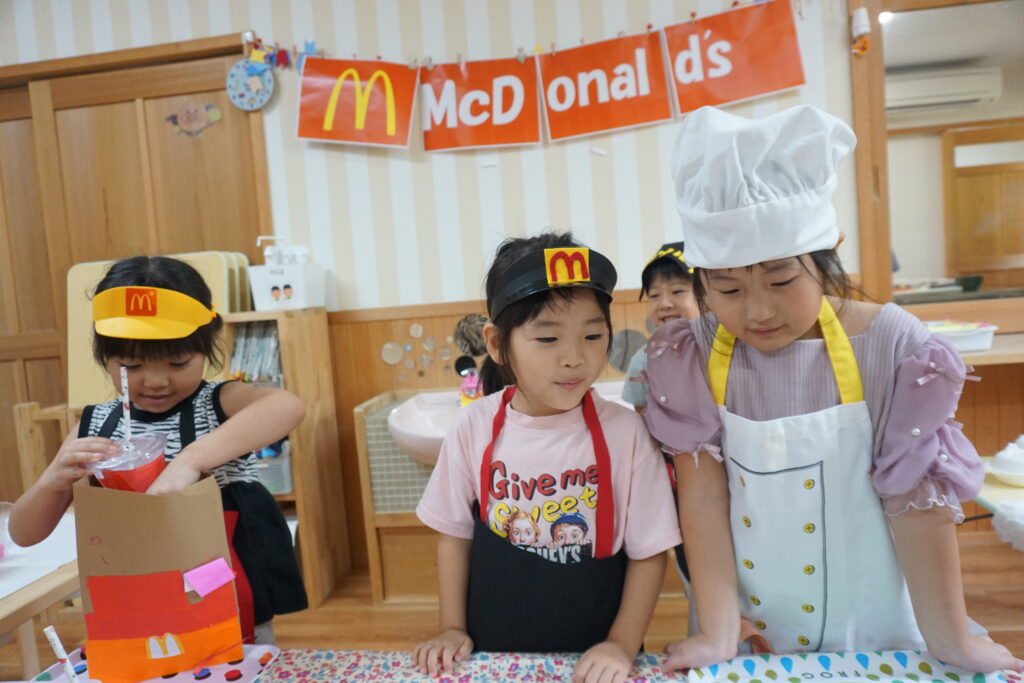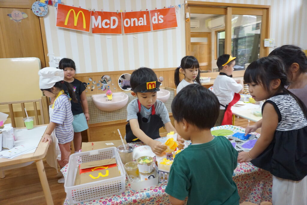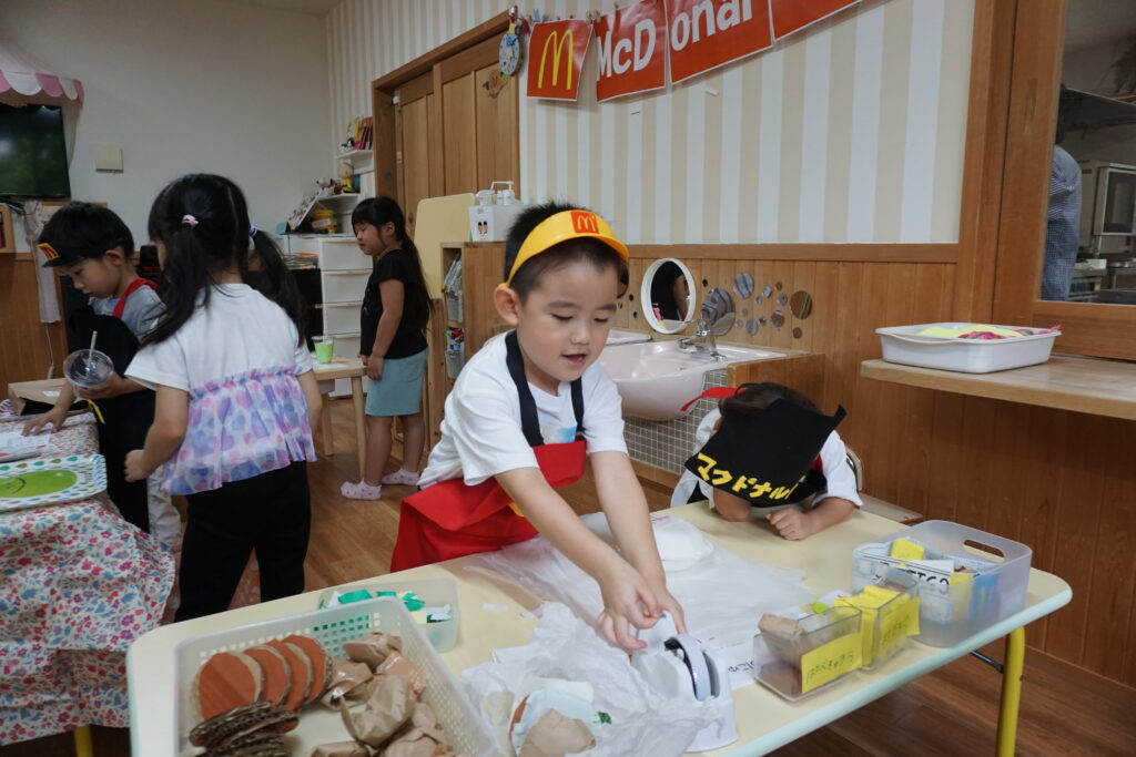 「チーズをはさんだら美味しそう」「ポテトはいっぱい入れたい」と友だちと相談しながら工夫して作る姿がありました。お店屋さんごっこでは「いらっしゃいませ~」「おもちゃはどれにしますか?」とやりとりも本物のお店屋さながら。製作を通して想像を形にし、その後のごっこ遊びに広がったことで、子どもたちの発想力や社会性が豊かに育まれた活動となりました。