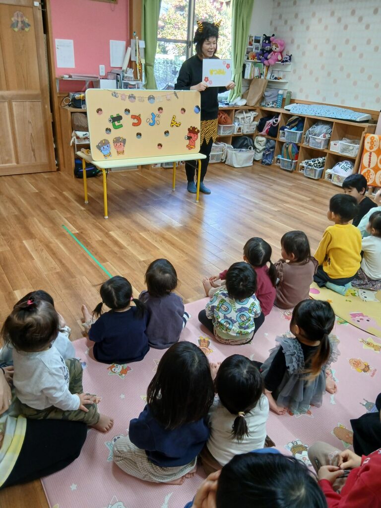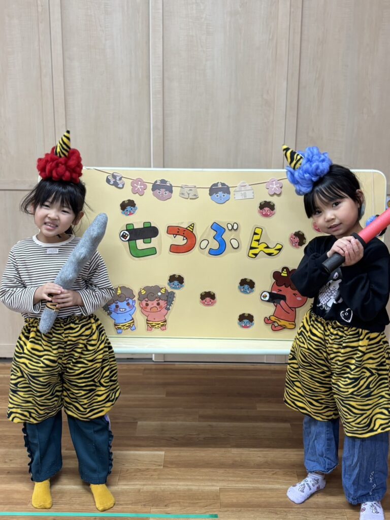 節分の由来や「鬼は外・福は内」の意味を聞いたあと、みんなで豆まきを楽しみました。鬼が登場すると少しドキドキしながらも、元気いっぱい豆をまき、心の中の鬼を追い出すことができました😊